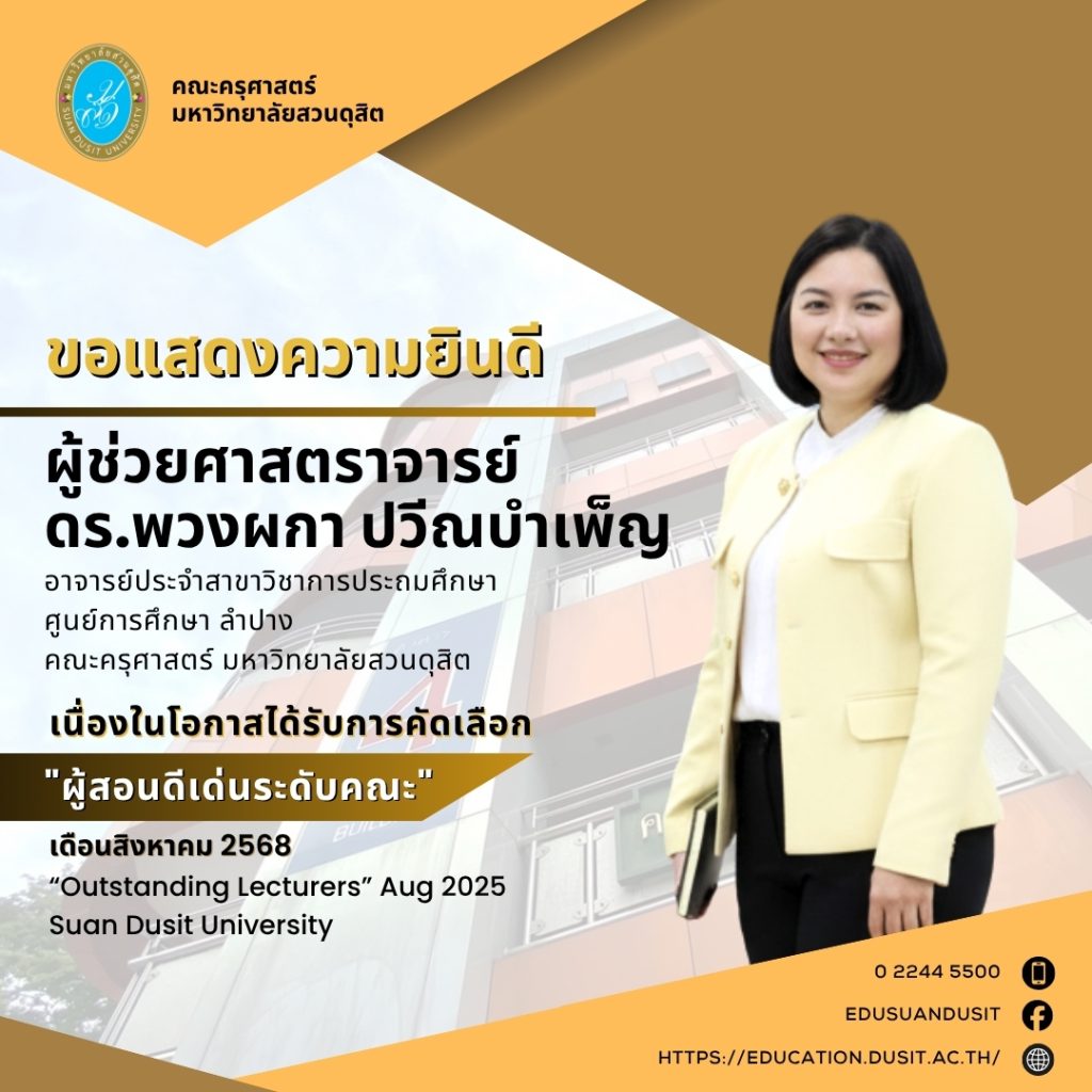 ขอแสดงความยินดี ผู้ช่วยศาสตราจารย์ ดร. พวงผกา ปวีณบำเพ็ญ ได้รับคัดเลือก “ผู้สอนดีเด่นระดับคณะ” เดือนสิงหาคม 68
