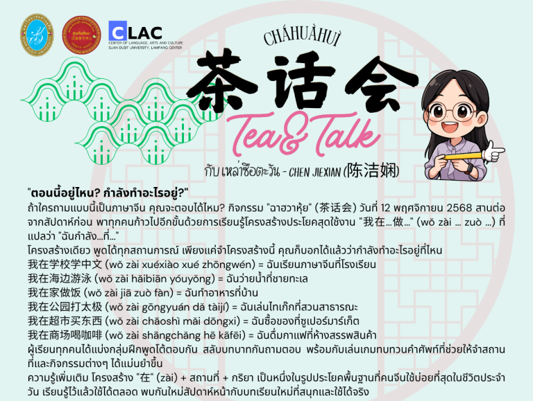 ข่าวสารประชาสัมพันธ์ Tea&Talk กับเหล่าซือตะวัน การเรียนภาษาจีนไม่ได้มีในห้องเรียนเท่านั้น12 พ.ย. 202512 พ.ย. 2025