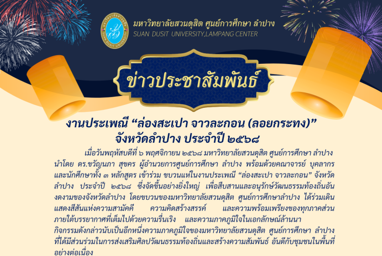 ข่าวสารประชาสัมพันธ์ งานประเพณี “ล่องสะเปา จาวละกอน (ลอยกระทง)” จังหวัดลำปาง ประจำปี ๒๕๖๘6 พ.ย. 202511 พ.ย. 2025